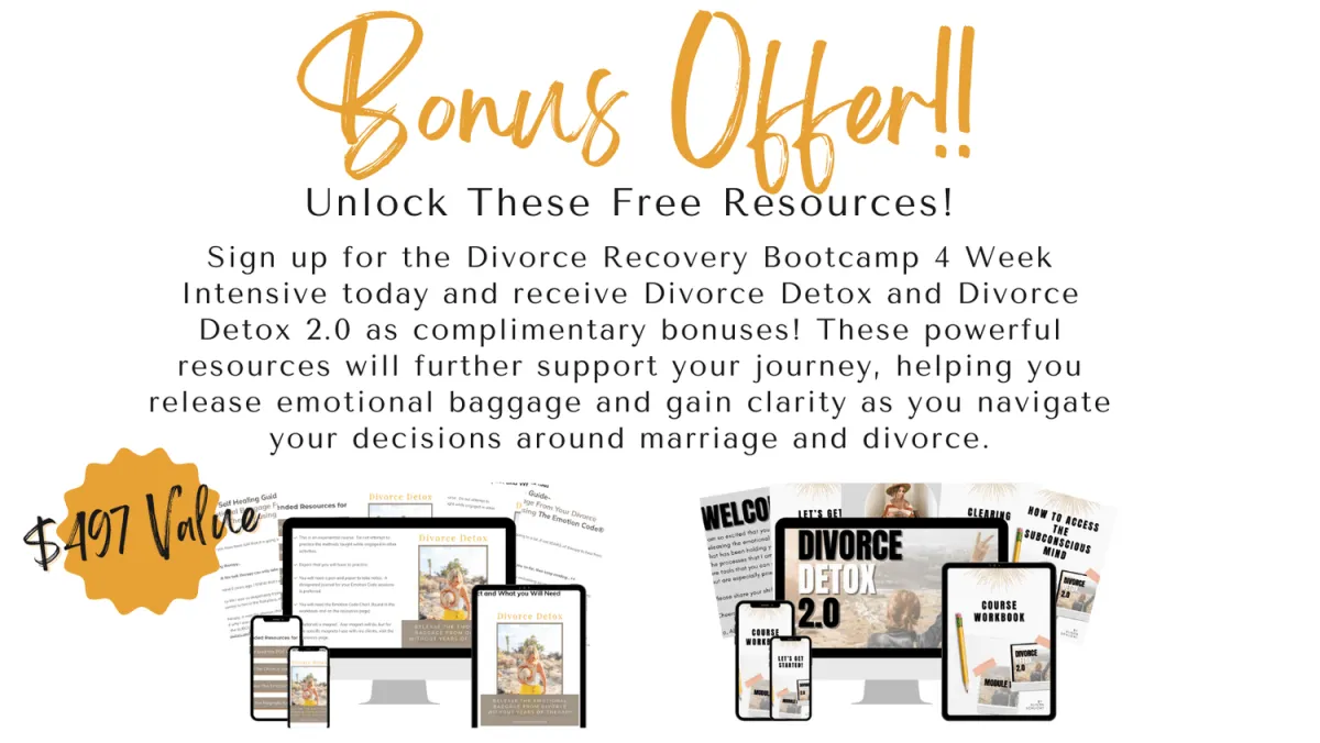 This bootcamp is designed for individuals who are ready to move forward from the pain, resentment, and emotional weight of divorce. Whether you’re newly divorced or have been struggling for a while, this program will guide you toward a fresh start, emotional freedom, and a clear vision for your future.